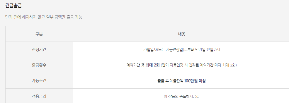 단 긴급출금 금액에 대해서는 중도해지 금리로 이자가 지급되며 중도해지 금리는 아래와 같습니다.