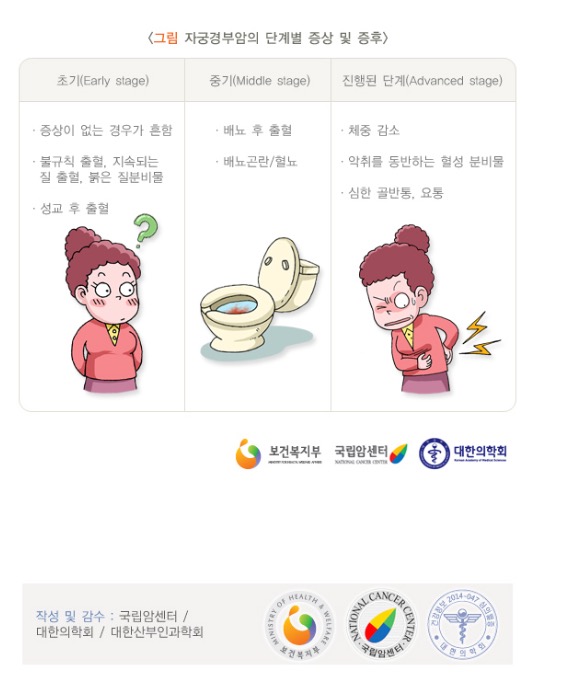 초기에는 대부분 환자에서 증상이 전혀 없으며, 진행된 후에 증상이 발생한다고 합니다. 그러므로 규칙적으로 산부인과에 가서 진찰과 자궁경부세포검사를 받는 것이 중요합니다.
