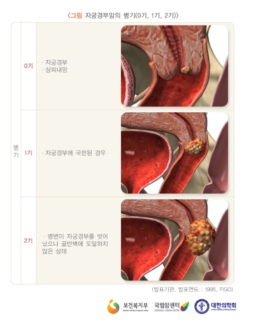 자궁경부암의 병기는 크게 1기부터 4기까지 나뉩니다. 0기는 상피 내에만 암세포가 존재하는 경우로 상피내암이라고도 하며 다른 곳으로 전이되지 않기 때문에 암의 분류에 속하지 않습니다. 1기는 암이 자궁경부에만 국한되어 있으며 다른 부위로 퍼지지 않은 경우, 2기는 병변이 자궁경부를 벗어났으나 골반벽으로까지는 퍼지지 않았으며, 질벽 상부 2/3까지 침윤한 경우, 또는 자궁 옆 결합 조직에 침윤된 경우, 3기는 병변이 질의 하부 1/3까지 침윤되거나 골반벽 침윤 또는 요관 침윤으로 신장이 부은 경우, 4기는 병변이 주변 장기(방광이나 직장점막)를 침범하거나 원격전이가 된 경우를 말합니다.