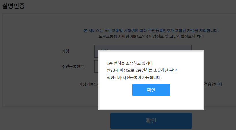 1종보통 적성검사를 클릭 후 아래처럼 실명인증 후 절차에 따라 신청하시면 됩니다.