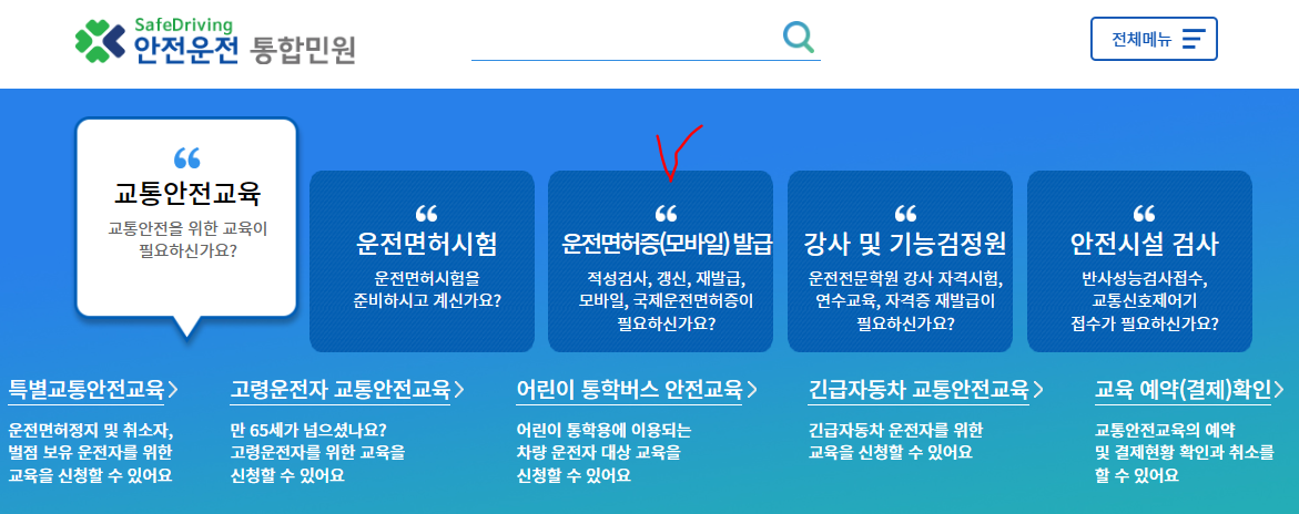아래의 안전운전 통합민원 홈페이지를 먼저 접속 후 빨간색으로 체크한 운전면허증 발급을 클릭합니다.