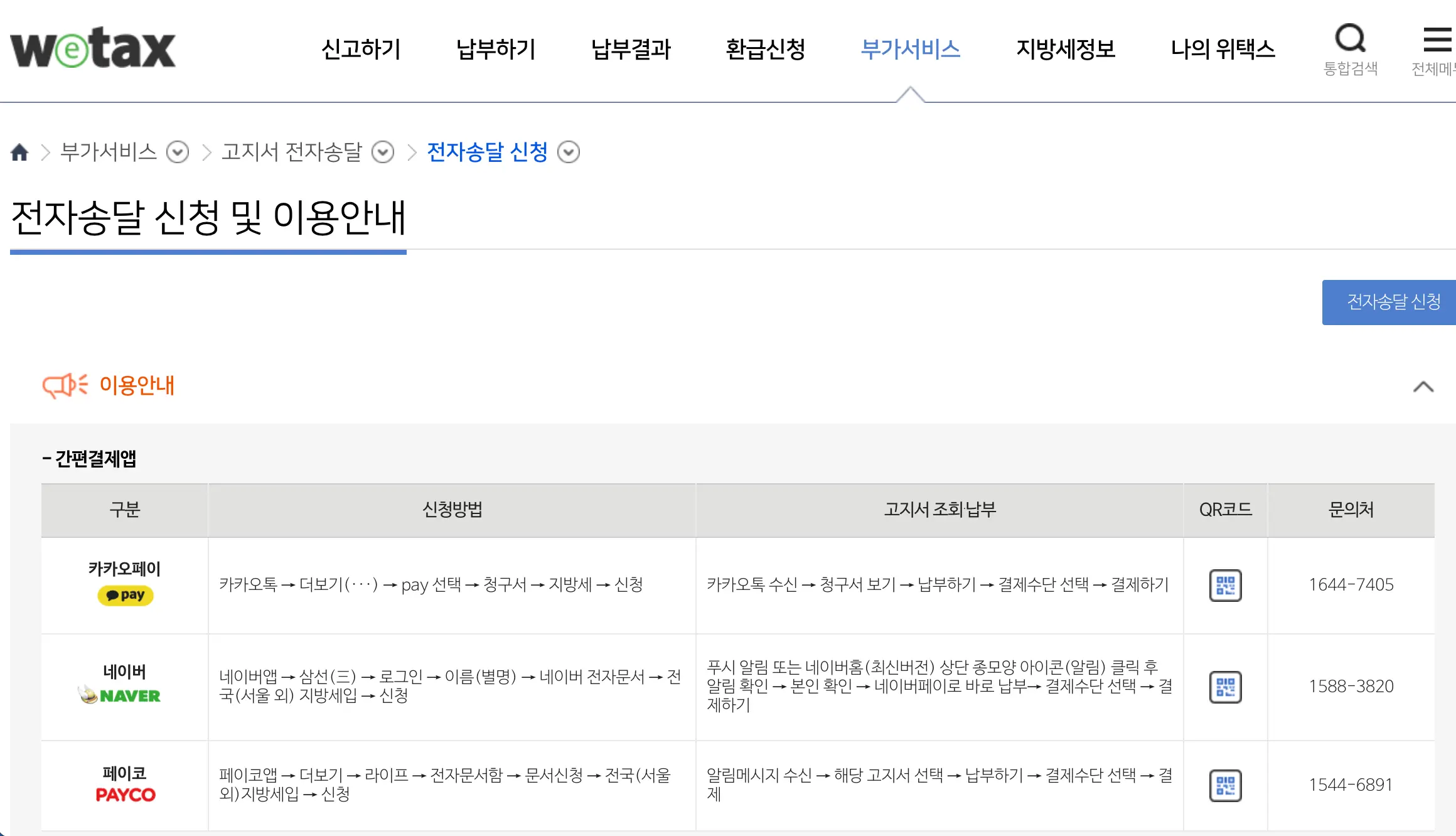 자동차세도 앞에서 언급한 것처럼 지방세에 들어갑니다. 만약에 내가 거주하는 시가 서울시면 이택스에서 납부를 하면 되고 서울시가 아닐 경우라면 위택스에서 지방세 정보란을 통해서 자동차셀르 조회를 할 수 있습니다. 위택스 상단 메뉴의 부가서비스를 누르게 되면 고지서 전자송달란에서 전자송달 신청 부분을 통해서 신청을 하시면 됩니다. 아래 사진을 참조하시면 됩니다.