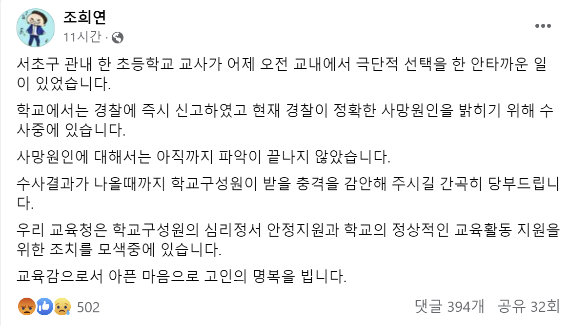 조희연 서울시 교육감은 페이스북에 글을 올려 "서초구 관내 초등학교 교사거 어제 오전 교내에서 극단적 선택을 한 안타까운 일이 있었다" 며 "경찰이 정확한 사망 원인을 밝히기 위해 수사 중" 이라고 밝혔습니다.