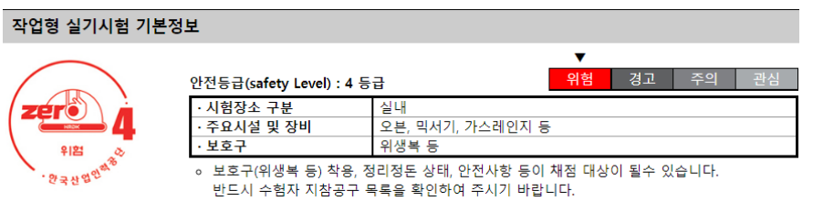 제과기능사는 오븐, 가스레인지 등 불을 사용하여 안전등급 4레벨의 시험으로 꼭 보호구(위생복 등) 및 수험자 지참공구 목록을 확인해 미리 챙겨가셔야 하며 안전 사항에 주의하시길 바랍니다.