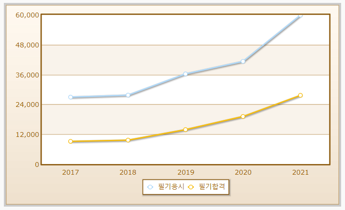연도별 필기시험 합격률이며 2021년 기준 응시자 수는 59,893명으로 그 중 합격자는 27,634명입니다.