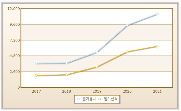 아래는 연도별 필기, 실기시험 합격률 표입니다.