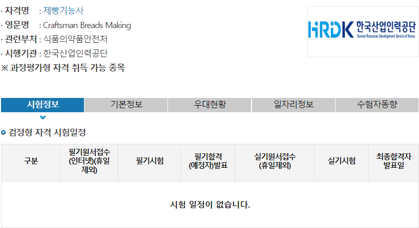 제빵기능사 시험은 상시 시험으로 따로 시험일정을 두고 있지 않아 상시 시험 일정에 따라 시험을 치루게 되며, 시험관련 일정은 큐넷 홈페이지에서 확인하실 수 있습니다.