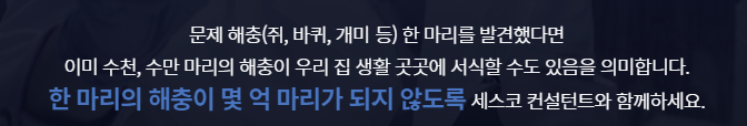 세스코는 대한민국의 최고의 환경위생 기업입니다. 세스코는 1976년에 설립된 이래로 해충방제, 공기질 관리, 식품안전 솔루션 등 다양한 서비스를 제공합니다. 세스코의 해충방제 서비스는 단순히 약제를 투약하는 것이 아니라, 정확한 진단을 진행한 후 상황에 맞는 1:1 솔루션을 처방합니다. 어떤 해충이 서식하고 있는지, 서식하는 종의 개체 수는 어느 정도인지, 해충의 침입이 쉬운 환경인지 등 현장 진단 이후 명확한 비용 안내가 가능합니다. 초기 해충 진단은 무료이니, 무료진단을 먼저 받아 보세요.