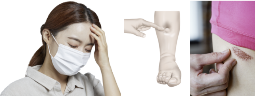 2. 피부 붉어짐 따듯해요: 통증 외에도 혈전 증상이 악화되면 피부가 빨갛게 변할 수 있는데요. 특히 빨개진 피부를 만졌을때 따듯하거나 뜨거운 느낌의 열감이 있기도 합니다. 반대로 피가 통하지 않아 피부가 파래지며 창백하게 변할 수 있습니다 .