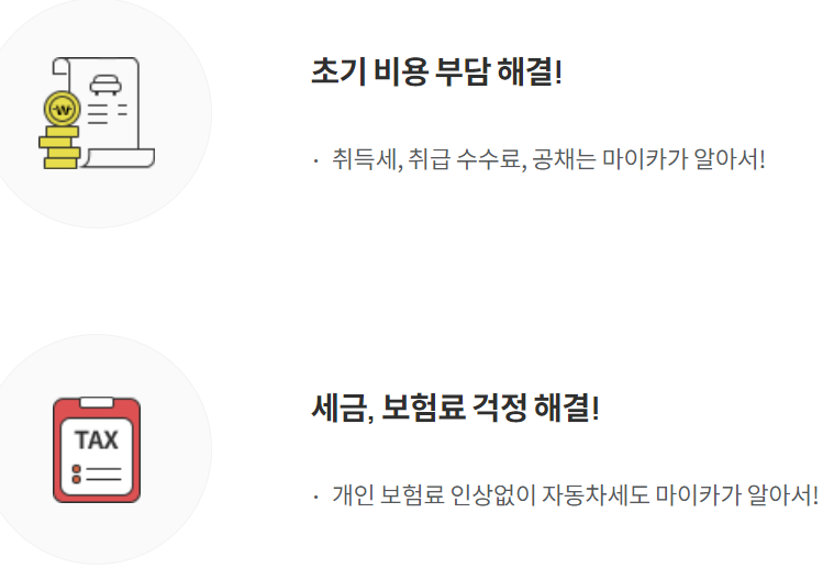- 첫째, 자동차 구입에 따른 취등록세 및 자동차세, 보험료가 없어서 할부구매/리스보다 경제적입니다. 세금 납부, 추가비용 걱정 없이 계약기간 동안 동일한 대여료로 이용하실 수 있습니다.