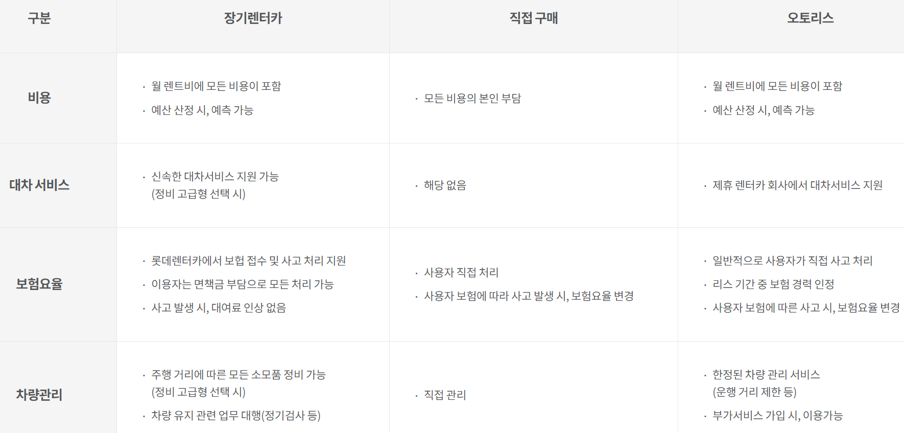 장기렌트카 저렴한곳 장기렌트 시 주의사항 등 장기렌트와 관련된 정보 알아보겠습니다. 장기렌트카는 차량을 직접 구매하지 않고 최소 24개월~최장 60개월 장기적으로 렌트하여 사용하는 차량운용 방법으로, 세금 및 보험, 차량 관리, 사고 처리 등 모든 차량관리 업무를 롯데렌터카에서 대행하여 편리하게 이용 하실 수 있습니다.